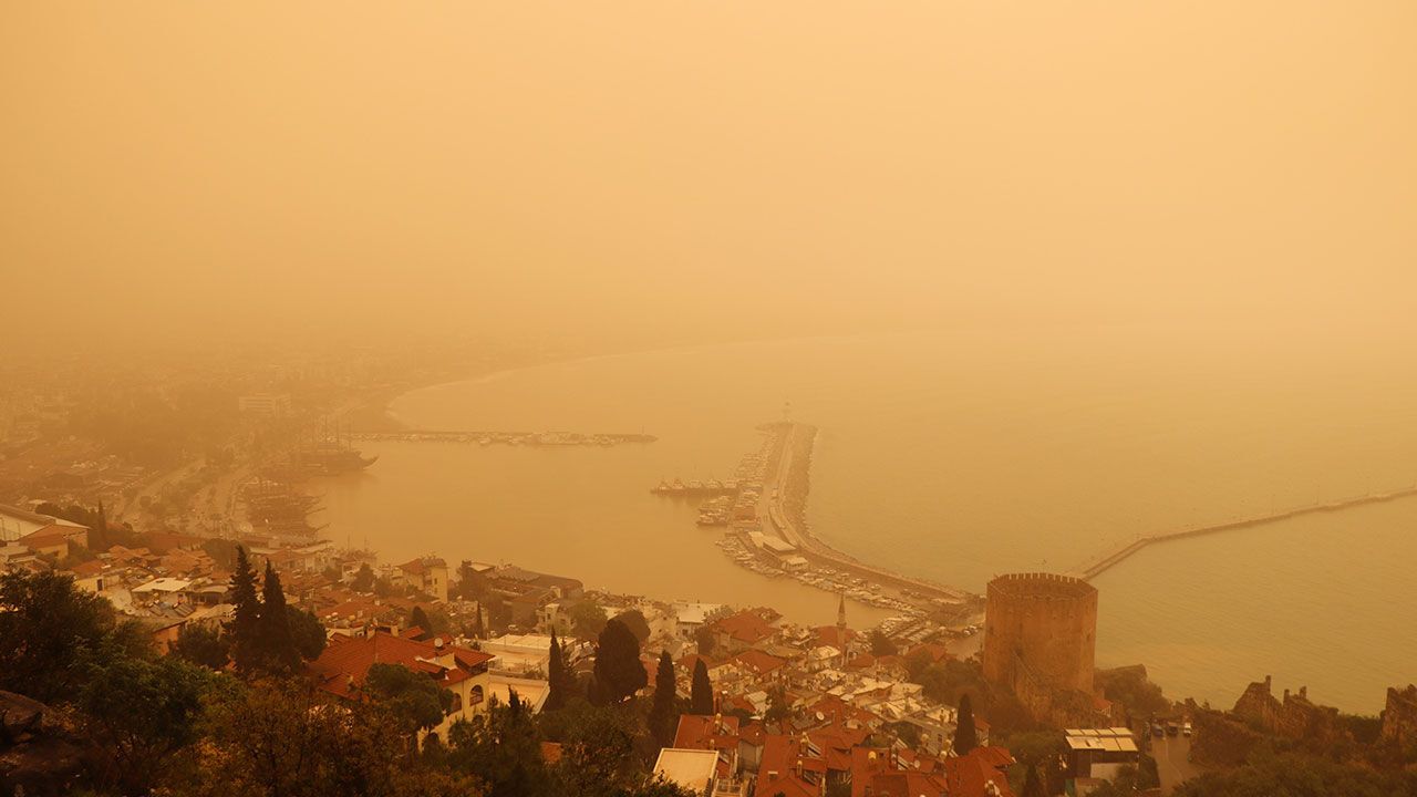 Türkiye’ye giriş yapan toz taşınımı, Antalya’da sabah saatlerinden itibaren etkili oldu. Hayatı olumsuz etkileyen toz taşınımı nedeniyle birçok noktadan kentin silüeti ve binalar görünmez hale geldi. Görüş mesafesinin düştüğü kentte, toz nedeniyle hava kalitesinde de düşüş yaşandı. Kenti çevreleyen Beydağları toz nedeniyle görünmez hale gelirken, gökyüzünün gri renge büründüğü görüldü.